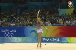 [ I was recalled a lovely episode. 2 days after the OG was ended, at the Beijing airport we met – hard to believe – among all the people there was Zhenya Kanaeva, the champion and the beautiful girl. We saw there was a leather circle in her hand holding, and we noticed that it contained her hoops for the OG. One of these hoops she actually used for her routines. I pretended to speak in a deeper tone (a more senior voice) and asked: “Zhenya, which hoop is the golden one?” And she showed it and said, “here it is and it has won me everything”. “Can you give it to me as a present?”, I asked. And Zhenya Kanaeva gave me the hoop. I thought at that time, “all her hoops are equally covered with gold”. And I was not mistaken. ]