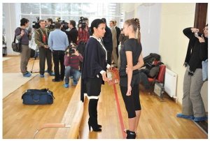 Reporter: When Evgenia Kanaeva works on the carpet, you cannot hear so common shout of the trainers. But you can see a smile on the face of Vera Shtelbaums and her student, even when the hoop in the new routine doesn’t want to fly in the right direction.