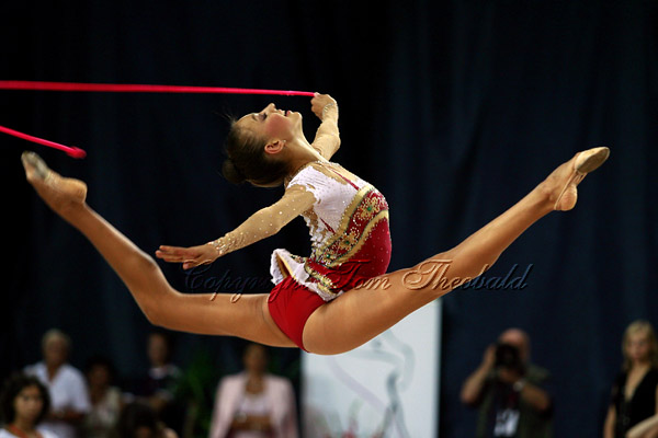 Evgenia Kanaeva of Russia split leaps with rope during senior All-Around at 2007 Ljubljana World Cup on August 25, 2007 at Ljubljana, Slovenia. (Photo by Tom Theobald)
