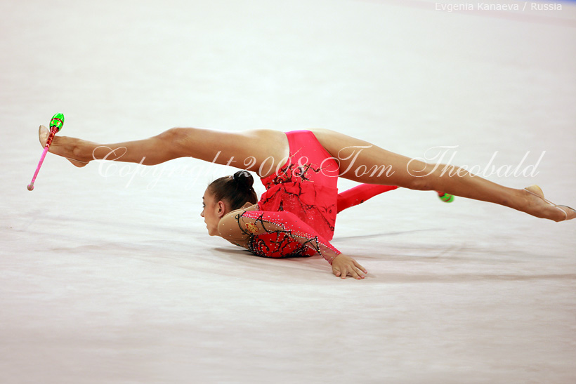 August 23, 2008; Beijing, China; Rhythmic gymnast Evgenia Kanaeva of Russia performs flexibility during clubs routine on way to winning gold in the All-Around final at 2008 Beijing Olympics.