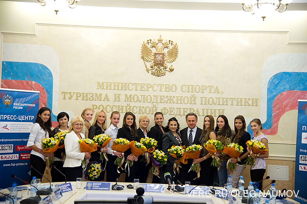 27 September Minsportturizma Russia met the Minister of Sport, Tourism and Youth Policy of Russia Vitaly Mutko with the Russian national rhythmic gymnastics. The meeting was devoted to the brilliant victory of the Russian gymnasts at the World Championships, held in Montpellier (France).