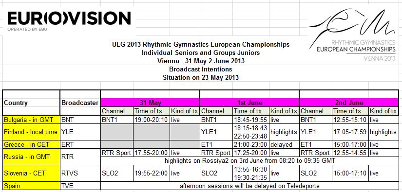 This weekend comes the big RG event – 29th European Championships 2013. The competitions will be held in Vienna from 31 May to 02 June for individual seniors team competition, event finals and junior groups. Masha is listed as reserve. Good Luck to all gymnasts, especially for my favor – Melitina Staniouta and Bulgaria junior group 🙂 🙂