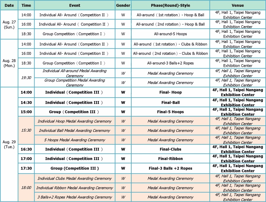 19-30 Aug, 29th Summer Universiade Taipei 2017 is held in Taipei, Taiwan. RG competition is from 27-29 August. Good luck to all gymnasts! Below are some information about this event: