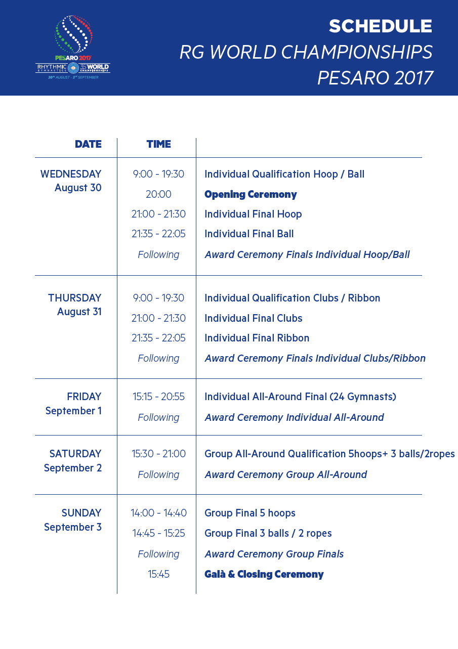 30 Aug.-03 Sep 35th RG World Championships will be held in Pesaro, Italy. No team competition this year. Good luck to all gymnasts. Following are some information about this event: